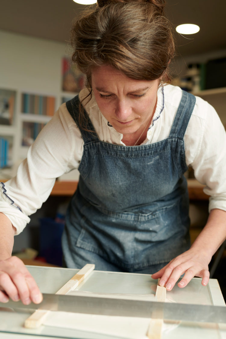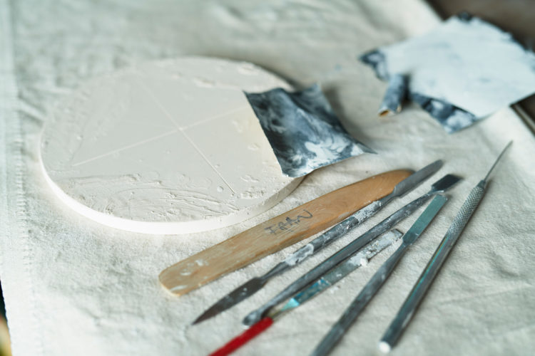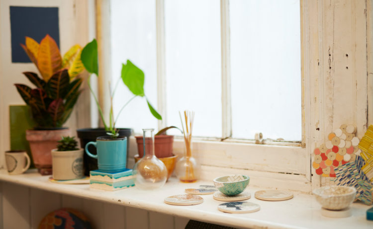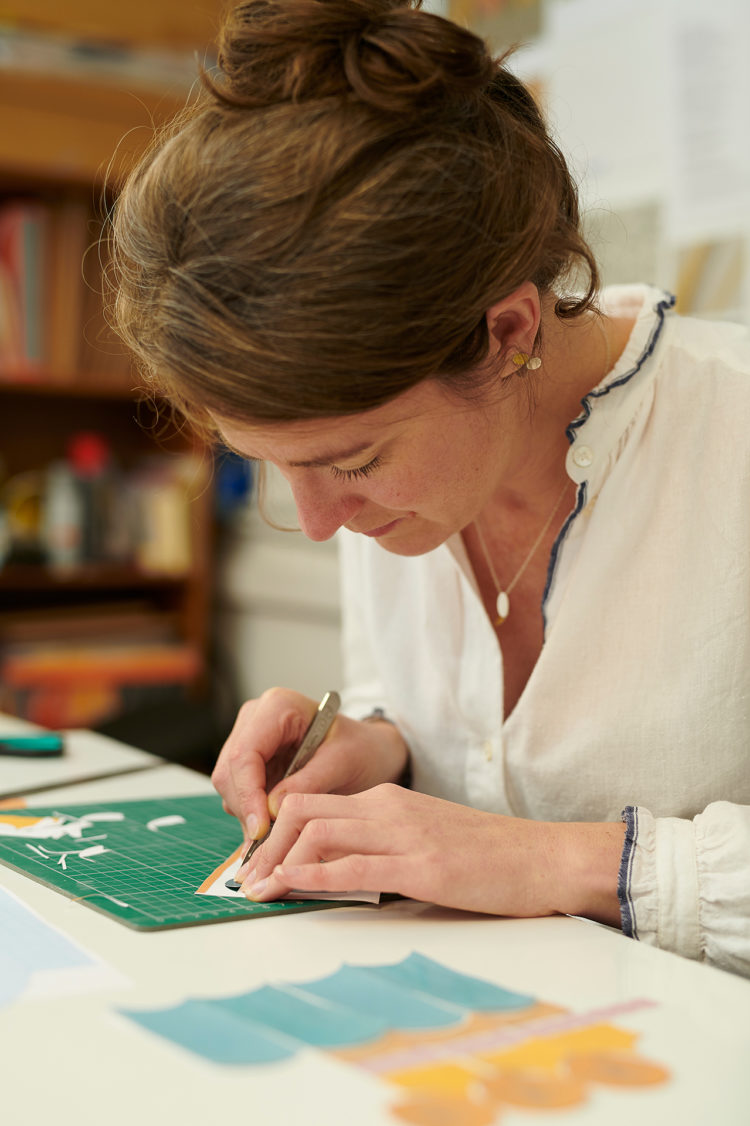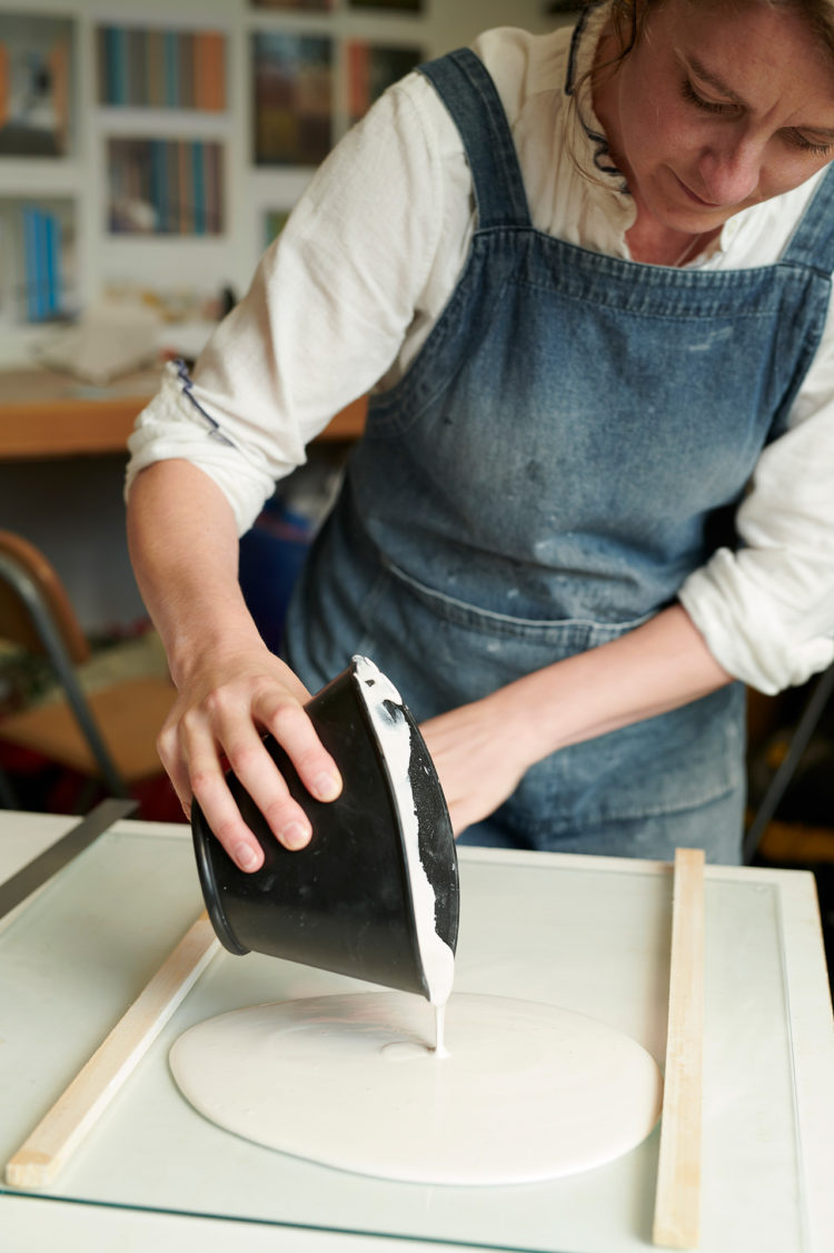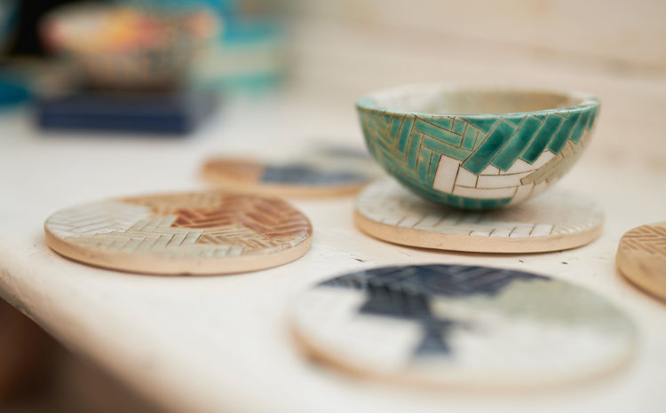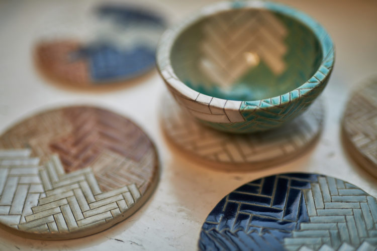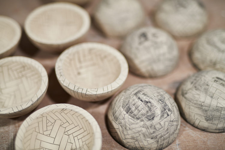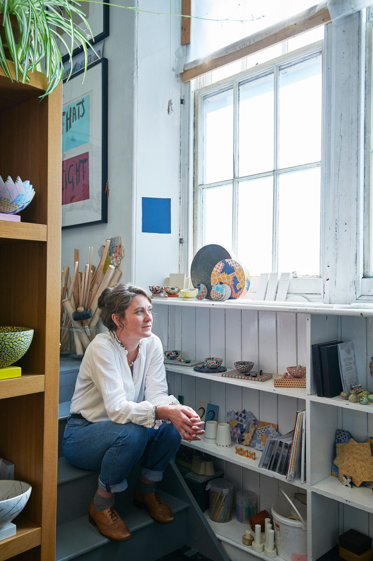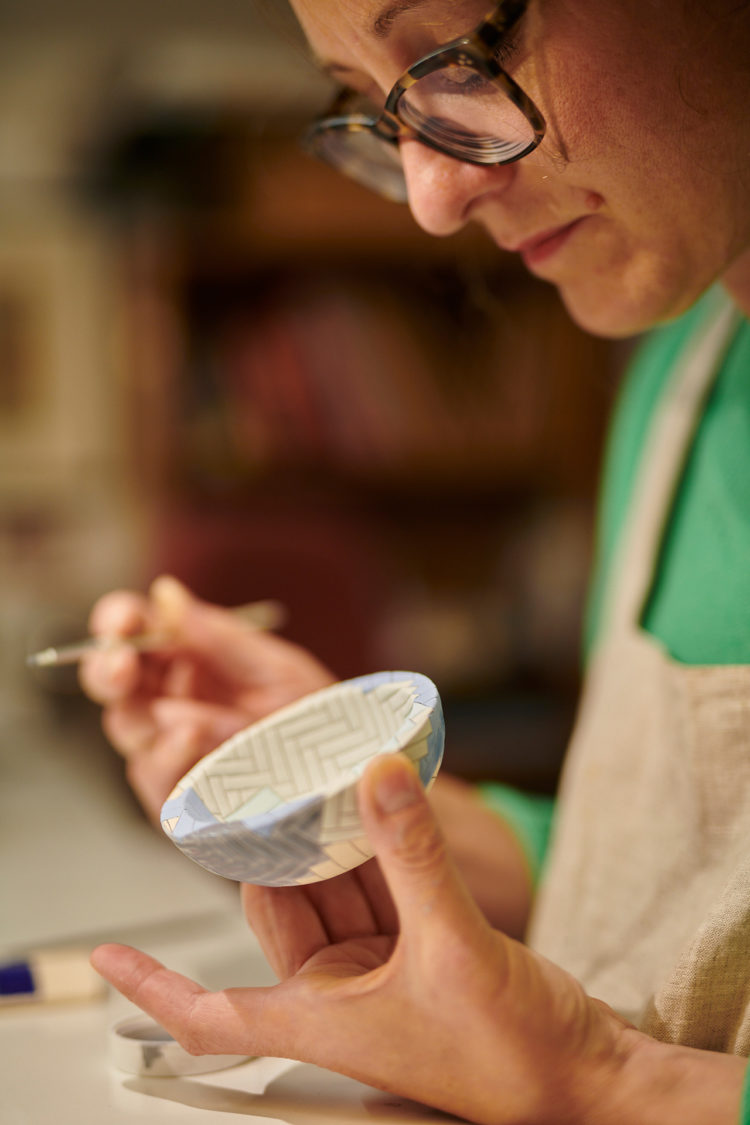 To make the bowls, first she presses a sheet of clay into a mould, which is left to dry to leather hard – “the perfect canvas for drawing onto” – before she inscribes the pattern into the surface using a scalpel. It is then bisque fired before Priest washes an oxide over the surface. “The oxide embeds itself into the drawn lines so you have a black and white drawing – like a colouring-in sheet onto which I apply the glazes.” The finished bowls sit on a small glazed ceramic square, “like a little plinth”. “Elevating the bowl gives it its own space and a sense of being precious,” says Priest.
