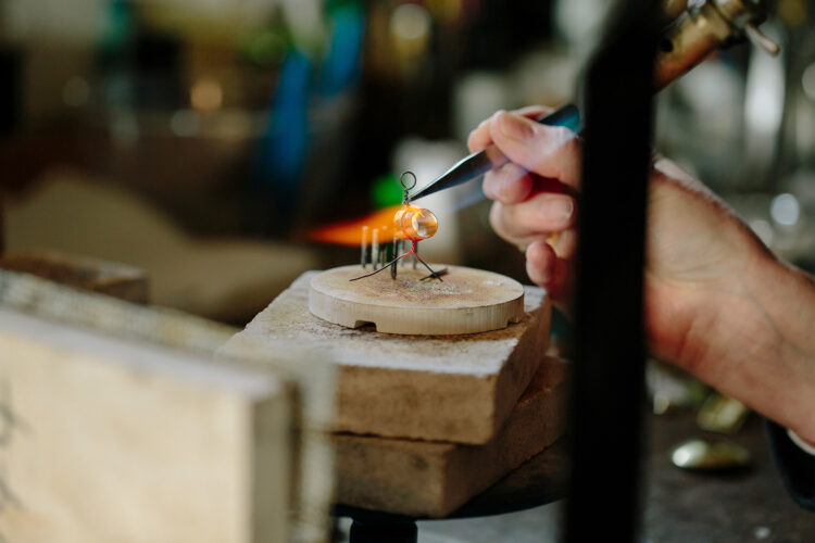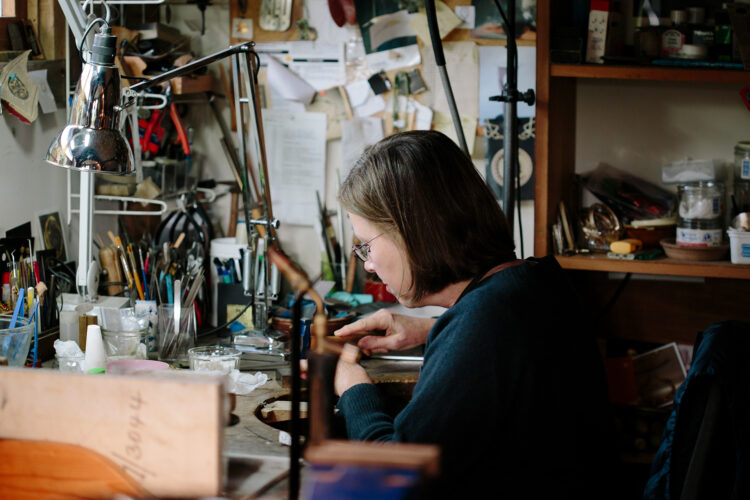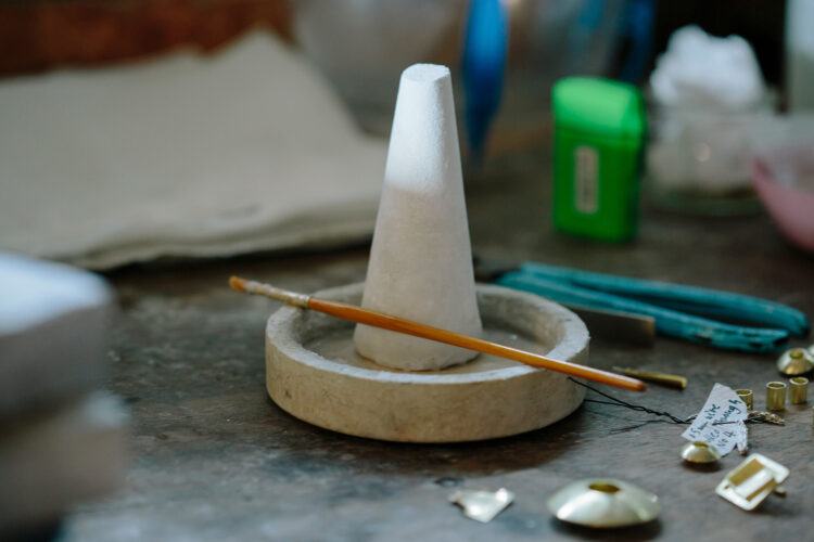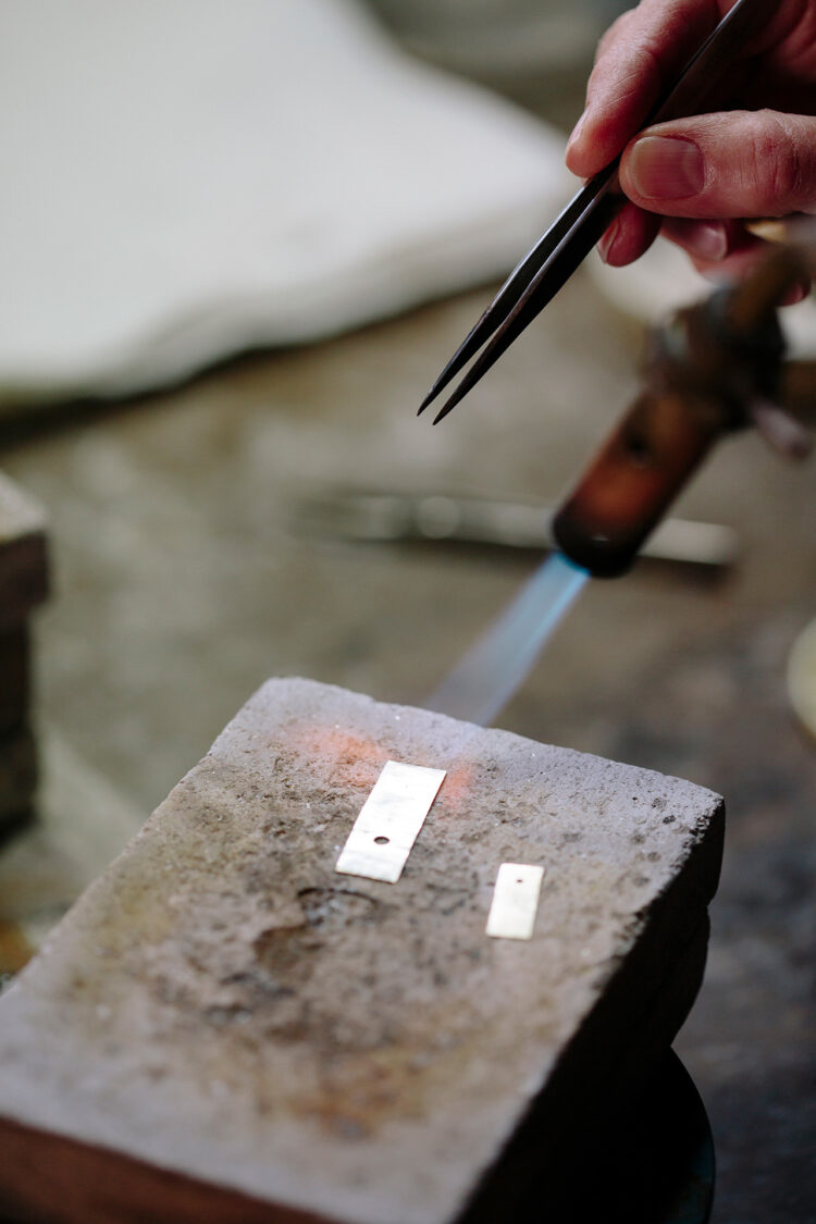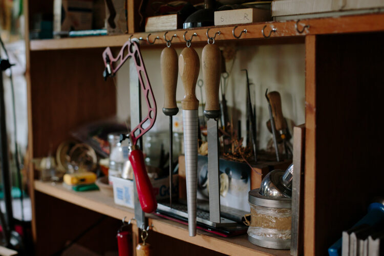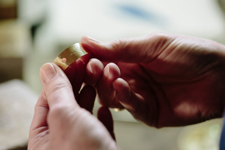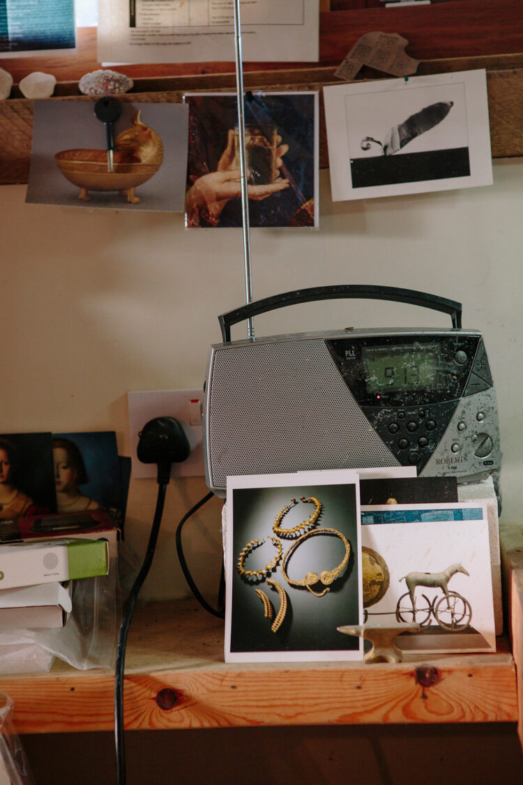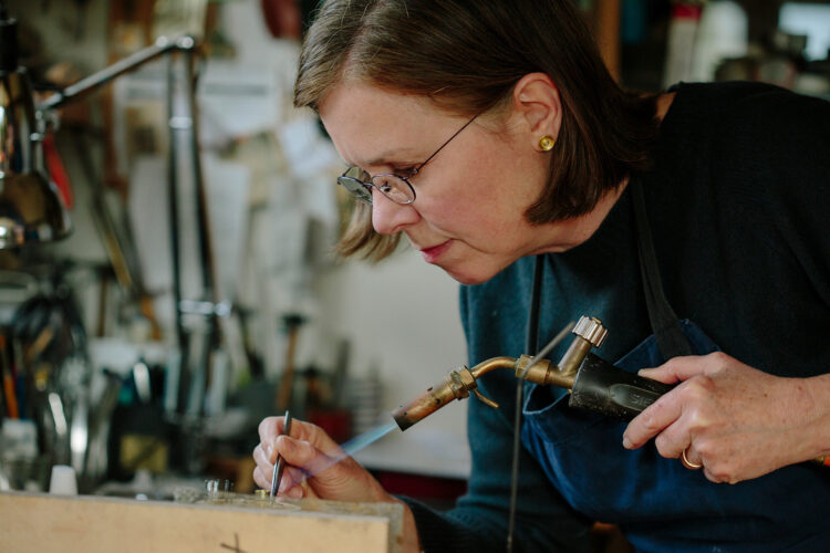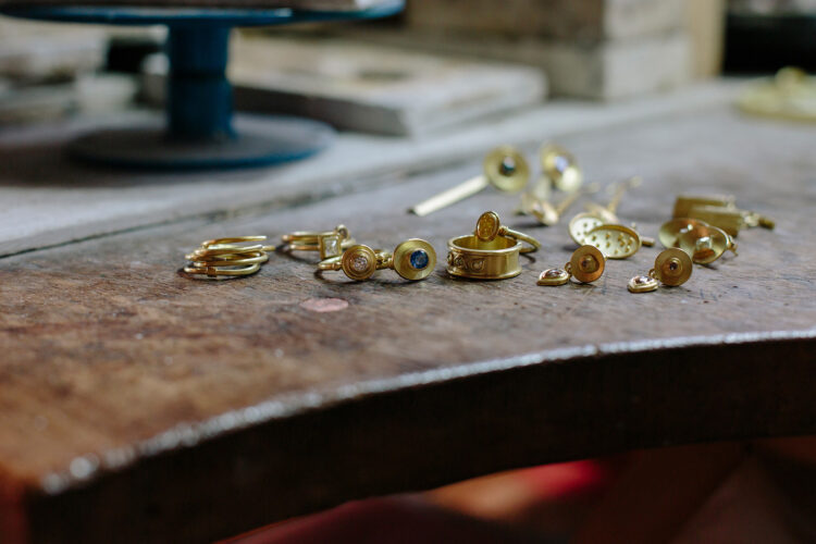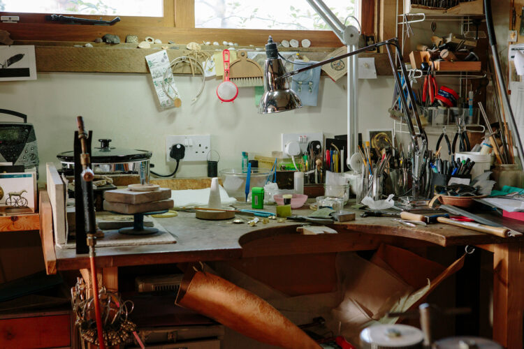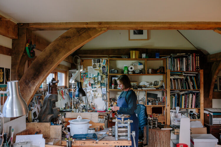 These days, she works in a timber-framed workshop in rural Sussex that she helped to design. “It was important to get the lighting right. As you heat precious metals, you need to be able to see their colour change to cherry red.”