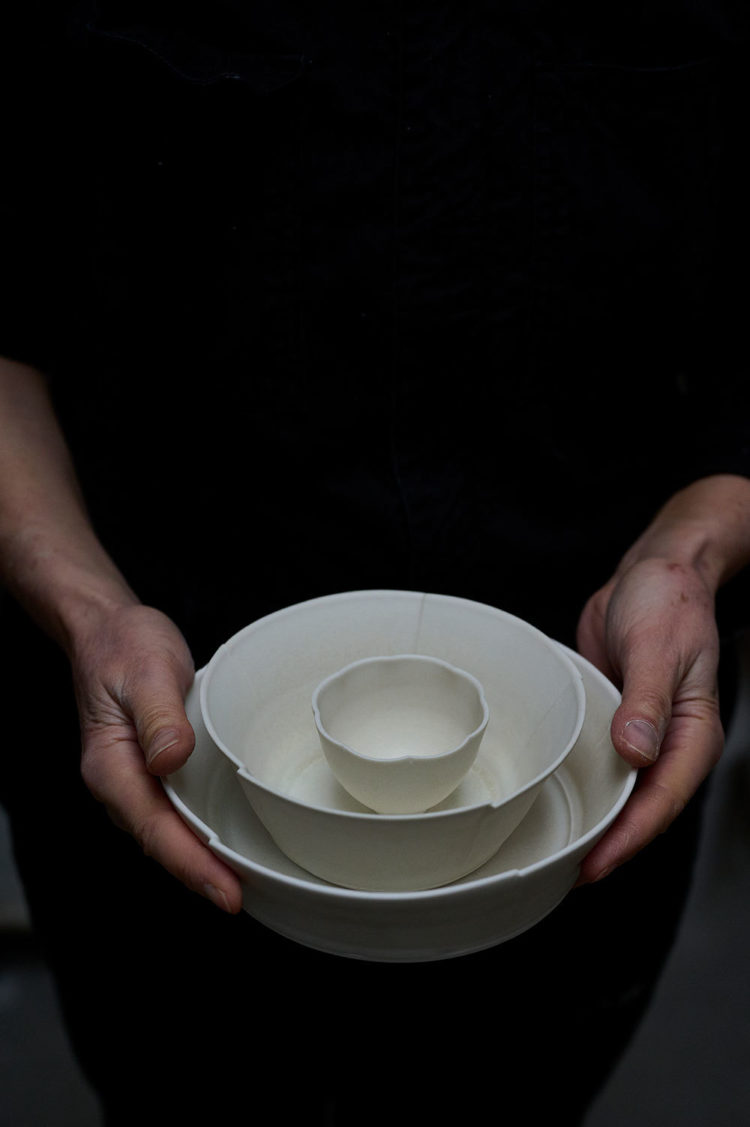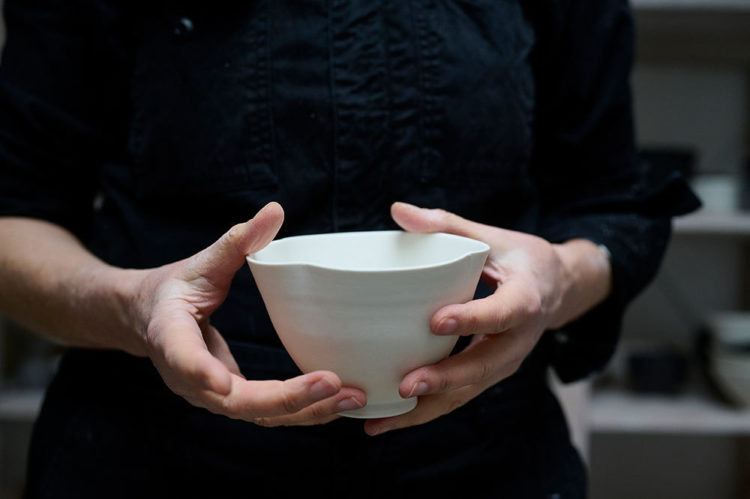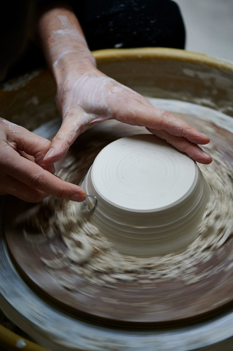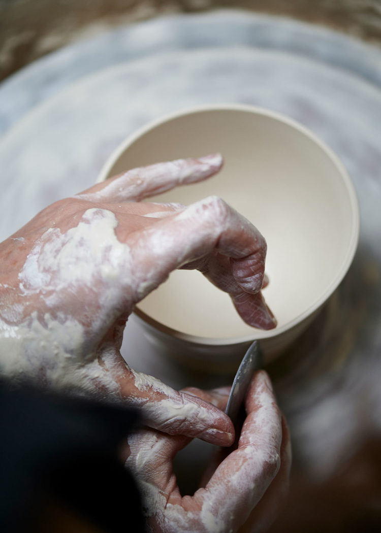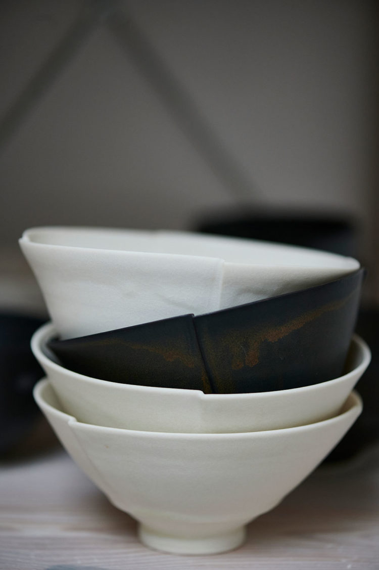 “I’m attracted to different qualities of clay: its plastic state (I leave traces of wet marks or little deposits of clay that well up with throwing); the leather hard stage which allows alteration of form by cutting and joining, pinching and impressing. I am – as most studio potters are – attracted to the elemental aspect of the material. For the same reason, while I throw pots in series, I do not look for exact reproduction, but enjoy the variation that conveys what is human, dependent on fluctuation of mood and attention. I throw thinly, so that the pieces are fine. Some people worry that my pots are too fragile for every day, but they are intended to be used and used. That is the point. I mostly use porcelain, but stoneware, too, and develop my own glazes.”