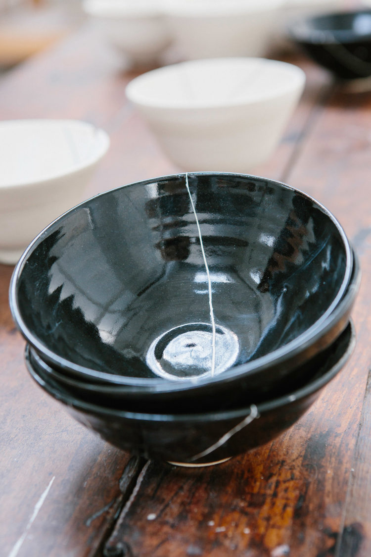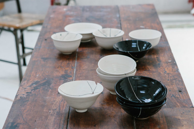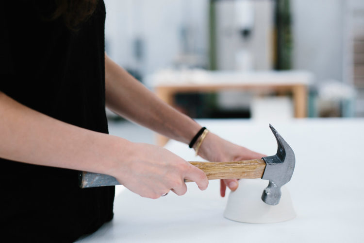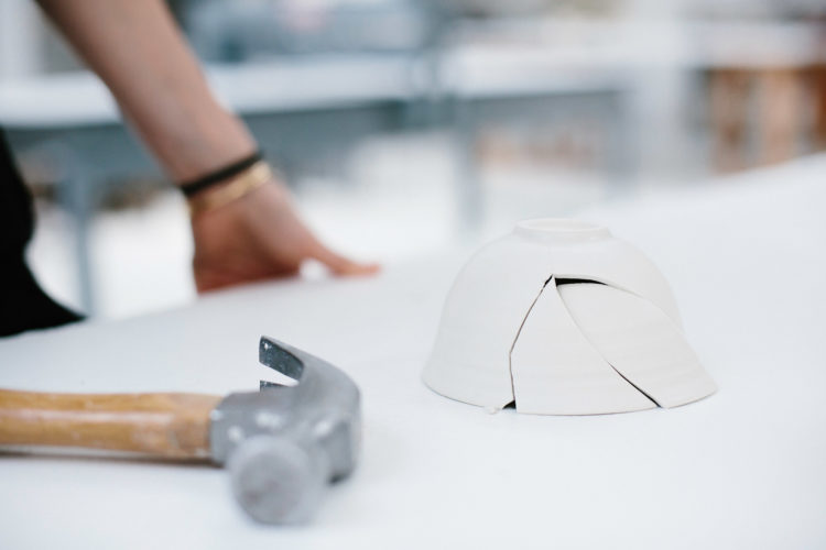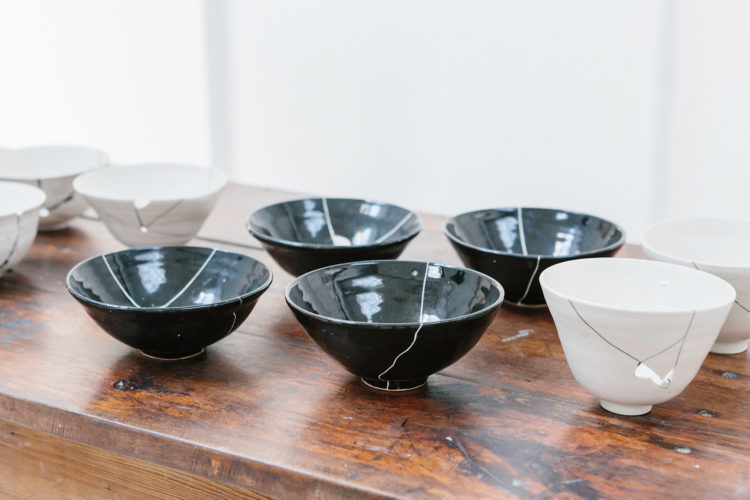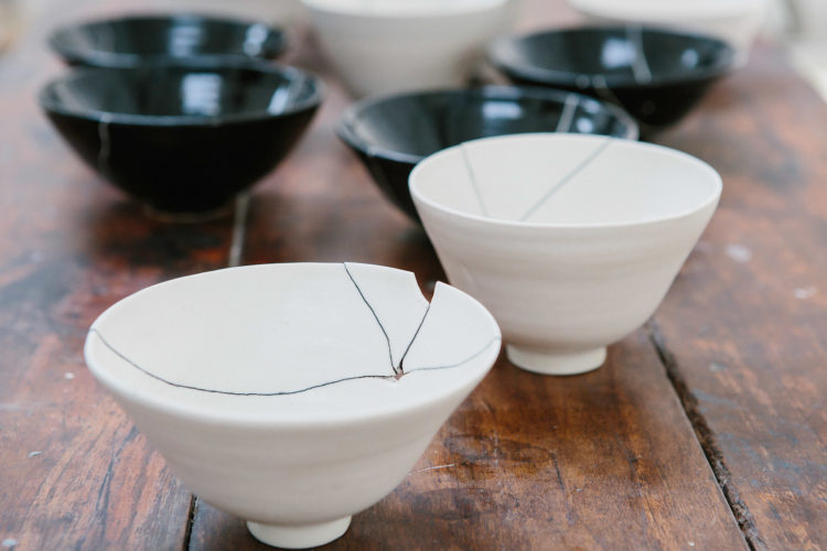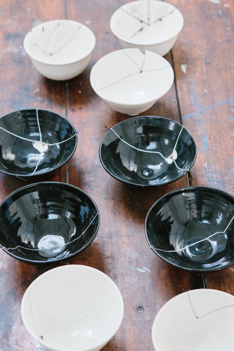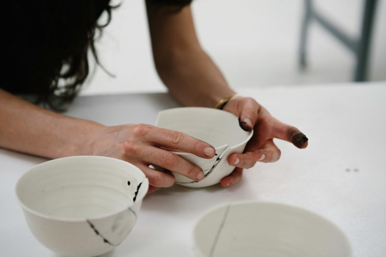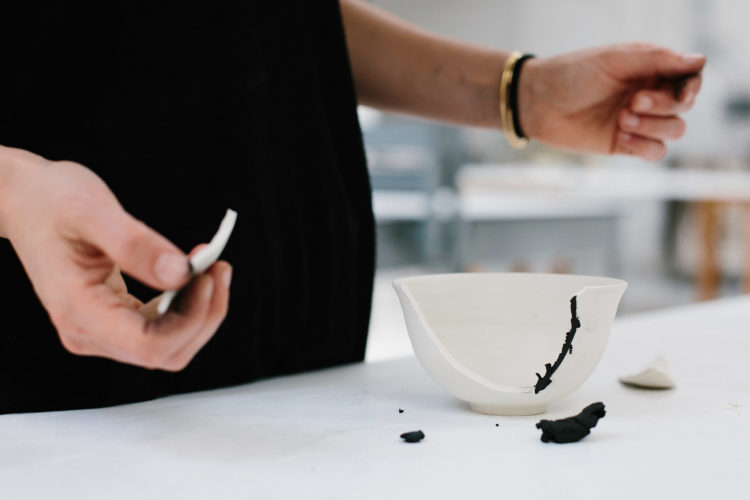Northover’s process for her Fractured collection is inspired by Kintsugi, the ancient Japanese technique of repairing broken pottery. Traditional Kintsugi pieces are broken unintentionally, but Northover deliberately breaks her bowls with a hammer.