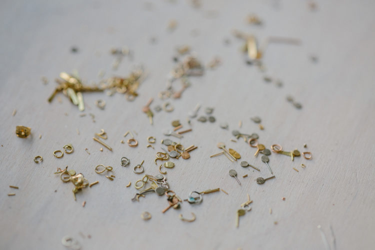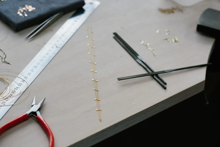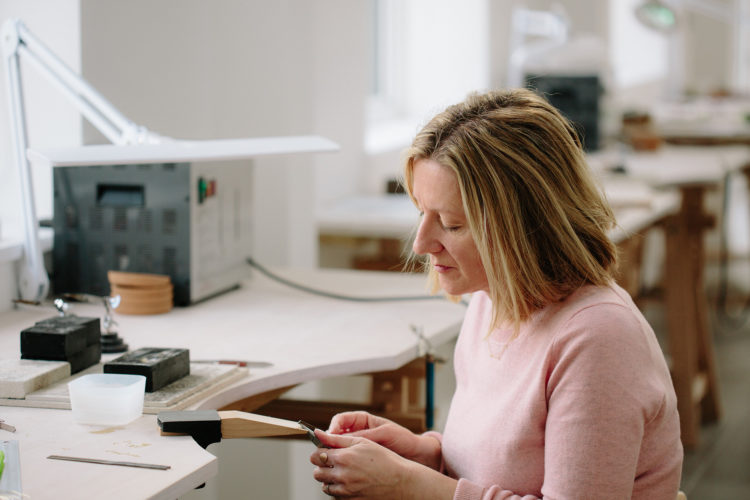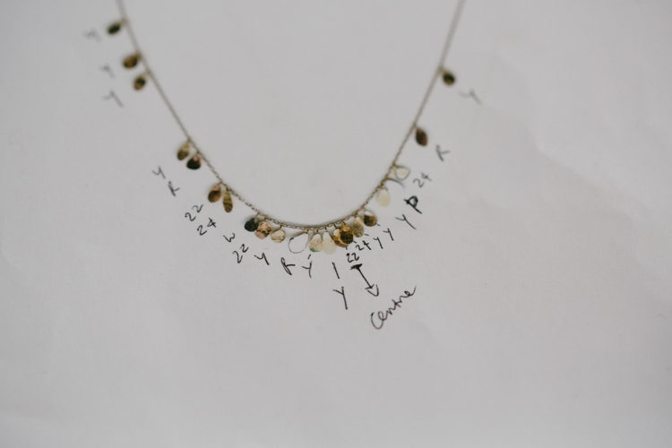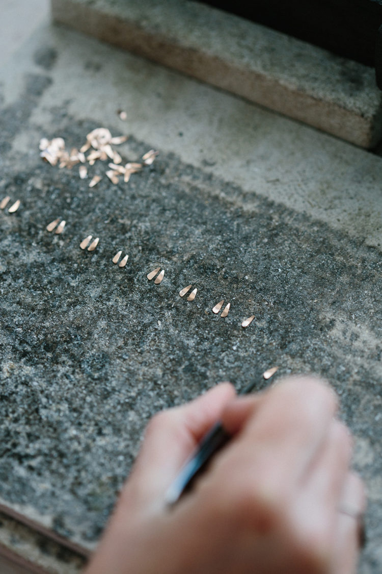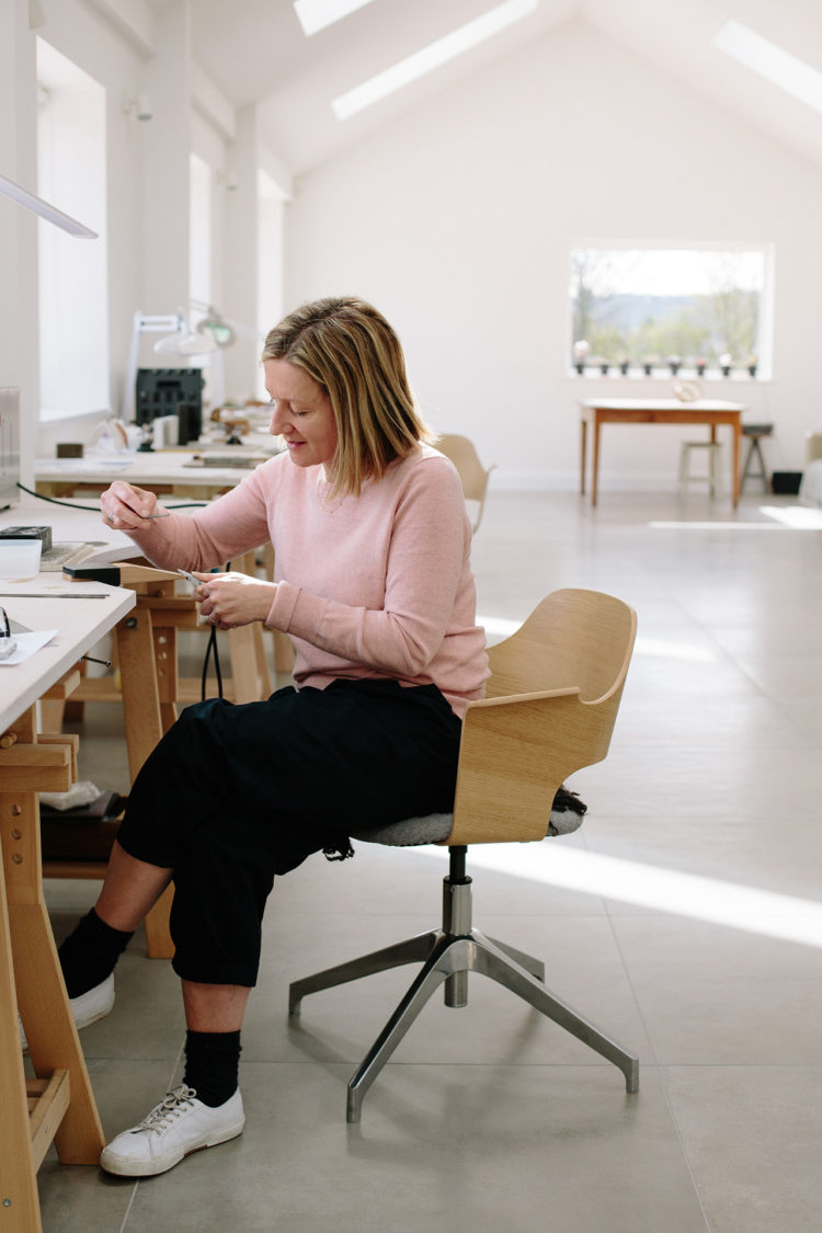 Each of her pieces is meticulously hand crafted in her light and airy studio in the Somerset countryside. “Much of the jewellery I make uses old-fashioned techniques. I always wanted to work in a basic way – working and cutting metals, soldering, hammering.” Many of the elements of her work are cut from sheets of gold. “I see them like blank sheets of paper. I often have quite abstract thoughts about what I want a piece to look like – I have an image of something that will look like rain or a piece of grass, but when I start cutting, it evolves and becomes something else. It is an organic process.”