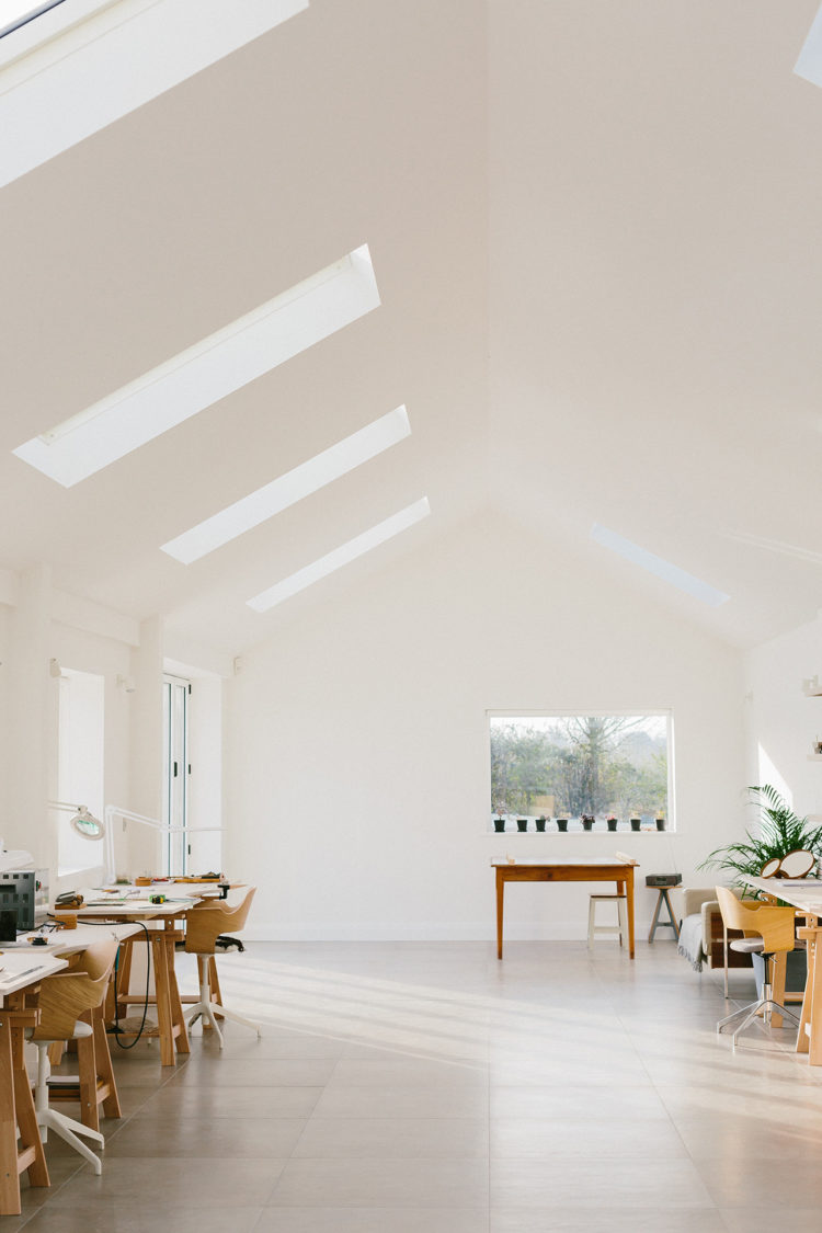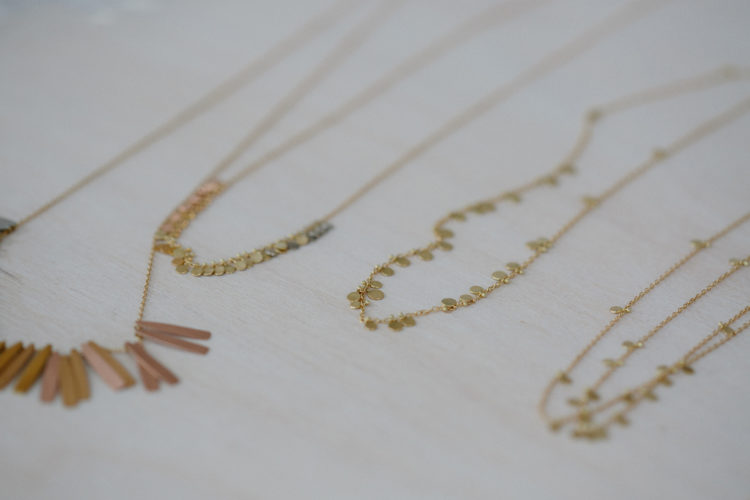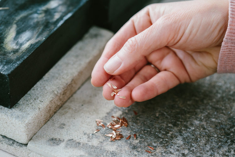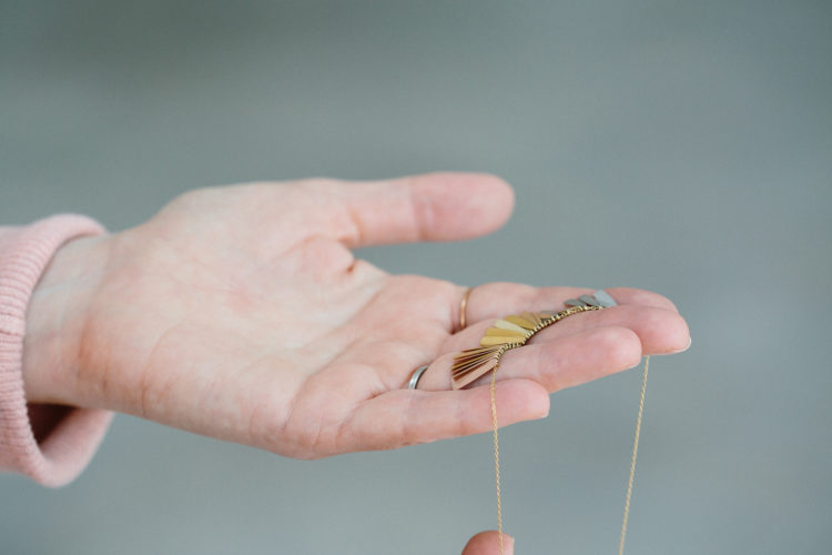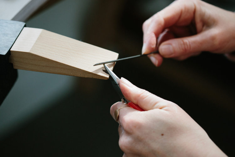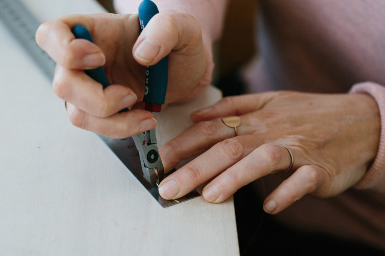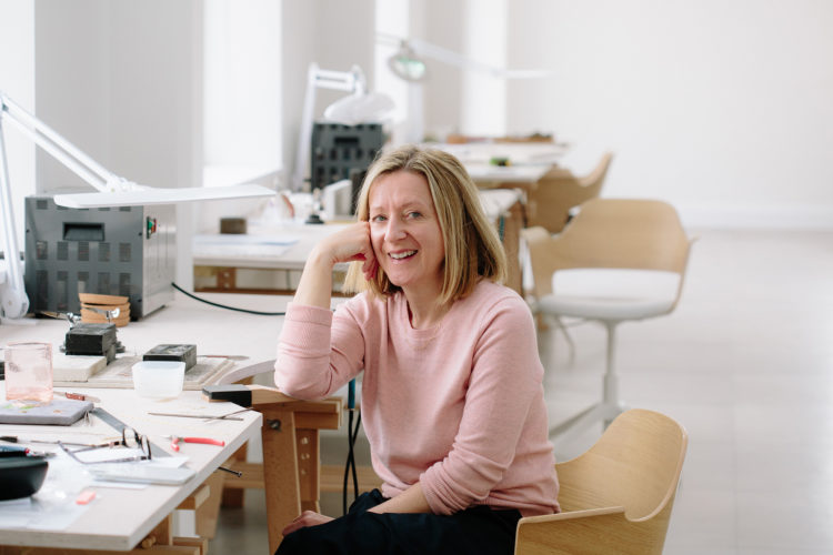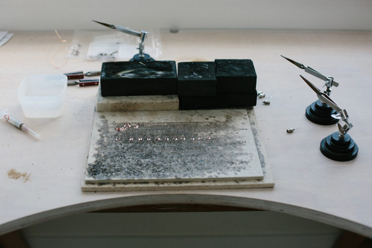 Each of her pieces is meticulously hand crafted in her light and airy studio in the Somerset countryside. “Much of the jewellery I make uses old-fashioned techniques. I always wanted to work in a basic way – working and cutting metals, soldering, hammering.” Many of the elements of her work are cut from sheets of gold. “I see them like blank sheets of paper. I often have quite abstract thoughts about what I want a piece to look like – I have an image of something that will look like rain or a piece of grass, but when I start cutting, it evolves and becomes something else. It is an organic process.”