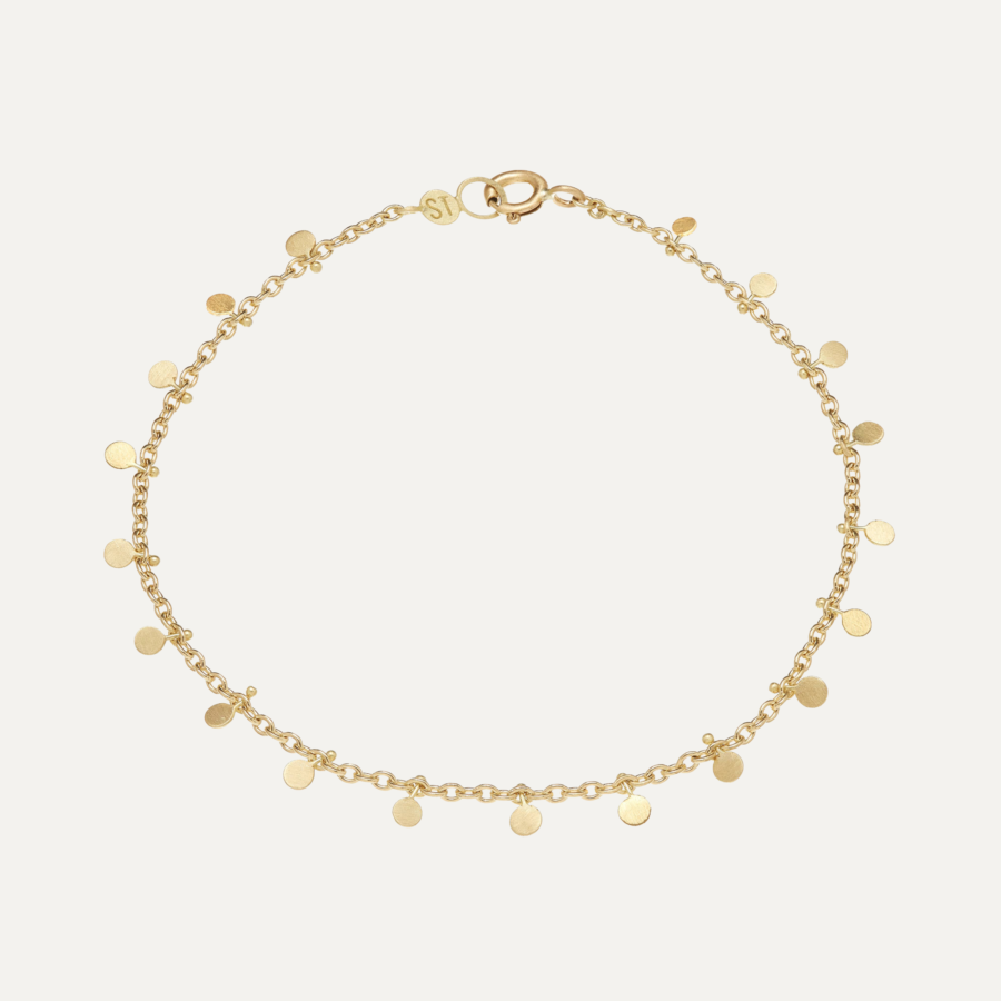 Handmade by Sia Taylor, this finely crafted bracelet features a fine 18 K gold chain accented with evenly spaced, hand-formed gold dots. Each element is carefully shaped and positioned, reflecting precision and quiet craftsmanship. The bracelet sits lightly on the wrist, offering subtle movement and elegance. Its minimalist design for which Sia Taylor is renowned, highlights the skill and attention inherent in every detail. Wear alone or layer with one of Sia's other bracelet designs.
