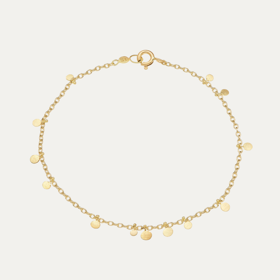 A fine gold chain becomes the ground for a series of small, hand-formed dots, each placed by eye rather than measure. What appears effortless is the result of close attention—every element shaped, spaced, and fixed in relation to the next. Designed by Sia Taylor, whose sculptural training informs her delicate, nature-led forms, it settles against the wrist with a soft, understated elegance.