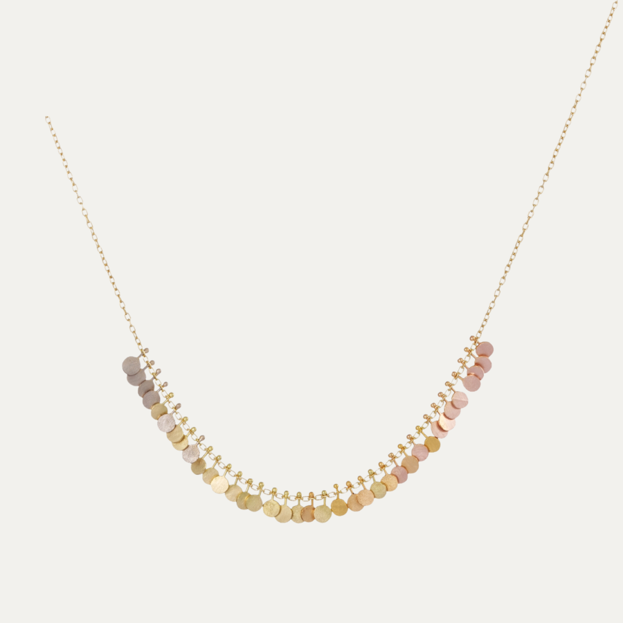 Sia Taylor’s Rainbow Tiny Dots Arc Necklace is a study in refined craftsmanship. A fine gold chain curves along the collarbone, dotted with tiny, individually hand-formed spheres. A delicate mix of yellow, rose, and white gold creates subtle shifts in tone as light plays across the surface. Each piece is handcrafted, ensuring unique variations that celebrate meticulous detail and enduring elegance in a design meant to be worn and treasured. Length 41.5cm/16.5"